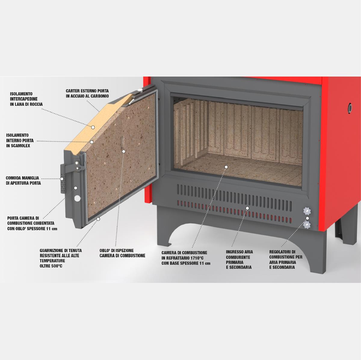 Generatore ad alta efficienza con accensione dall’alto con porta ad anta coibentata con oblò e camera di combustione special a camera secca