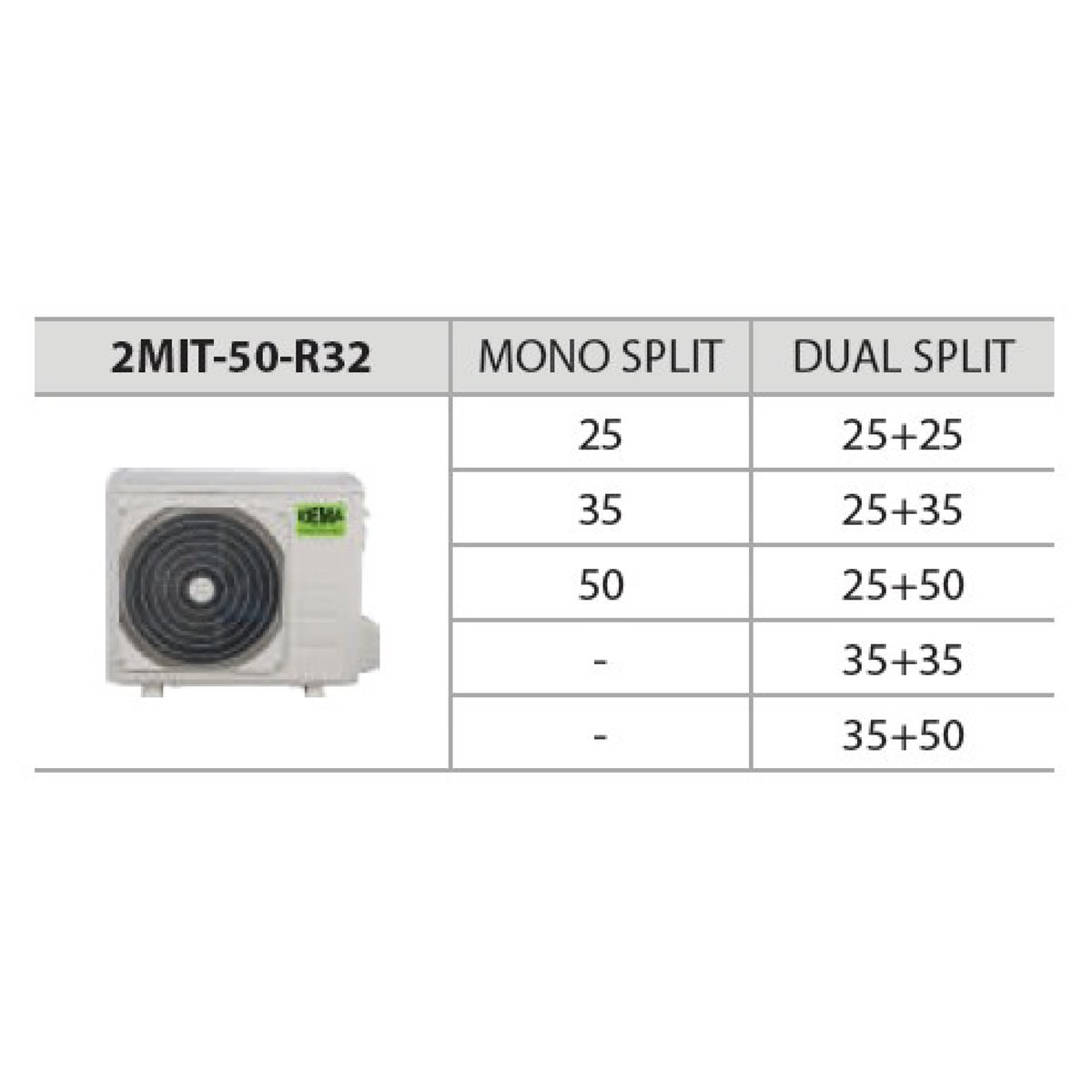 Il sistema proposto è composto di un’unità esterna MULTI DC INVERTER in pompa di calore con raffreddamento ad aria, due connessioni per le relative unità interne a parete (solo modelli ISPT), a console, a pavimento/soffitto, a cassetta 4 vie e canalizzabili in controsoffitto, di concezione molto avanzata ed in grado di fornire le massime prestazioni in termini di comfort ambientale, risparmio energetico ed affidabilità dotato di un compressore Inverter GMCC ad alta efficienza di tipo Rotary Brushless DC a giri variabili, con la tecnologia a onda sinusoidale e gas refrigerante R32;