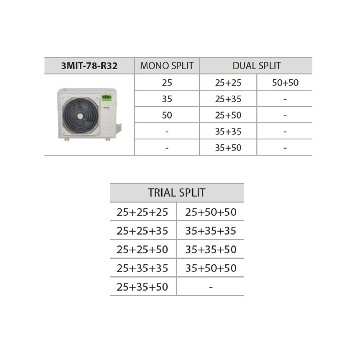 Il sistema proposto è composto di un’unità esterna MULTI DC INVERTER in pompa di calore con raffreddamento ad aria, tre connessioni per le relative unità interne a parete (solo modelli ISPT), a console, a pavimento/soffitto, a cassetta 4 vie e canalizzabili in controsoffitto, di concezione molto avanzata ed in grado di fornire le massime prestazioni in termini di comfort ambientale, risparmio energetico ed affidabilità dotato di un compressore Inverter GMCC ad alta efficienza di tipo Rotary Brushless DC a giri variabili, con la tecnologia a onda sinusoidale e gas refrigerante R32;