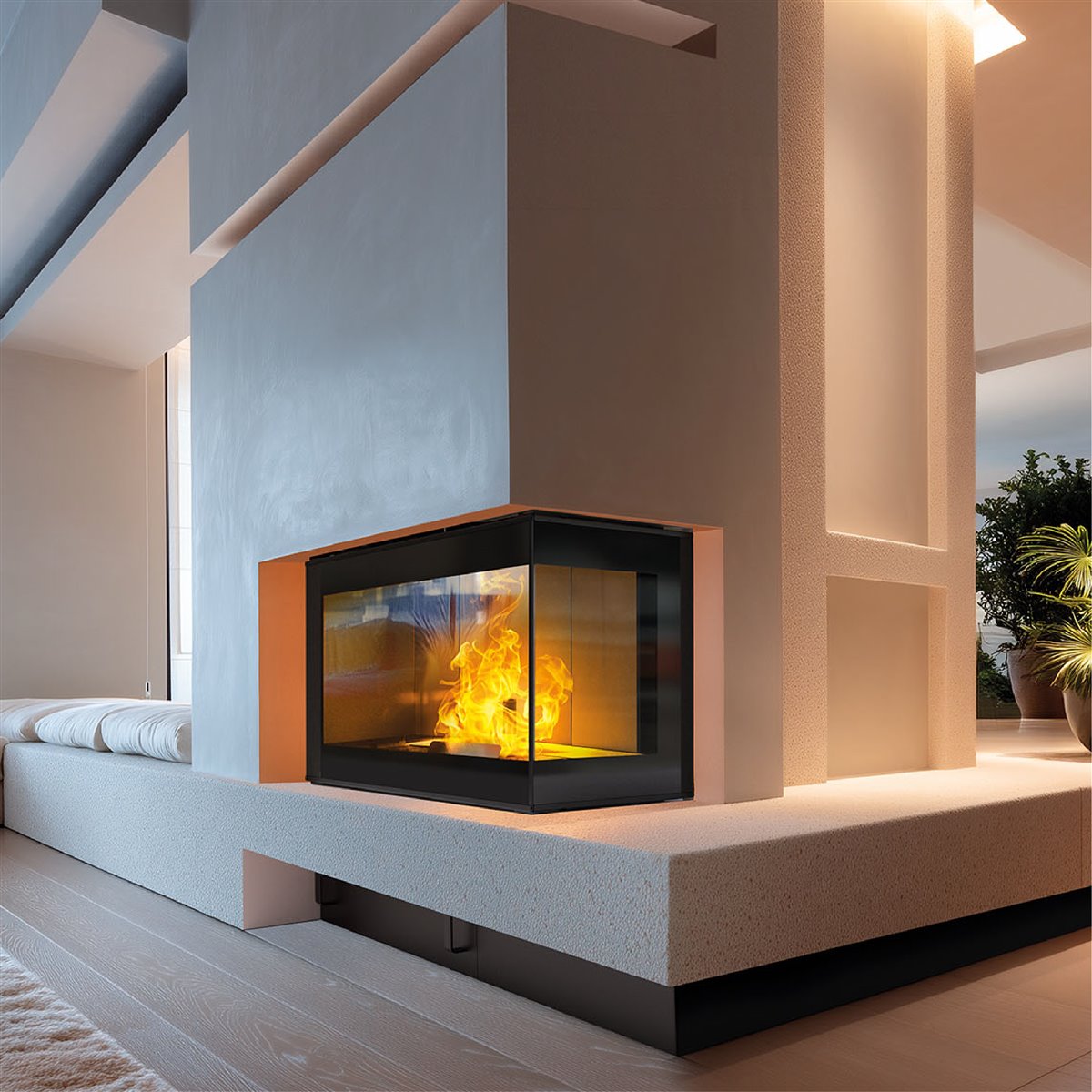 Vista fiamma angolare con piano fuoco in acciaio a pianta rettangolare e parete di fondo e fianchi in vermiculite.