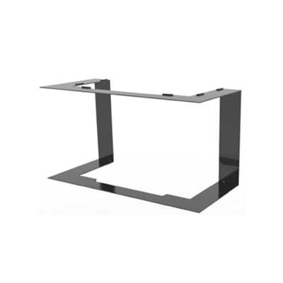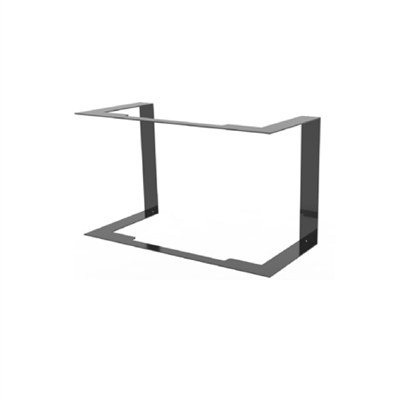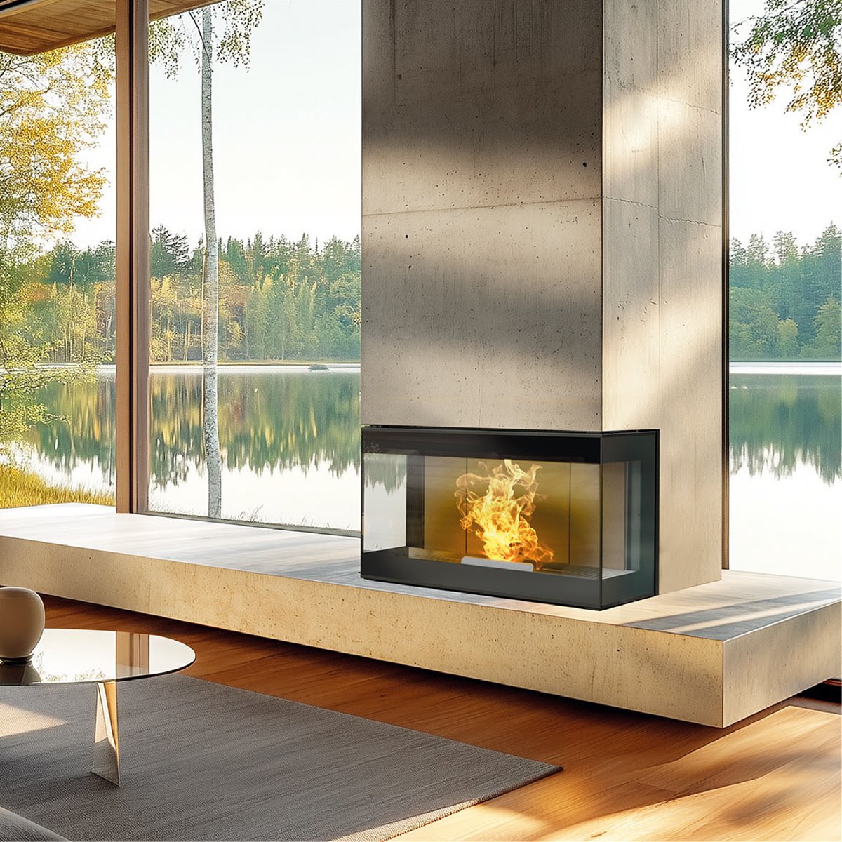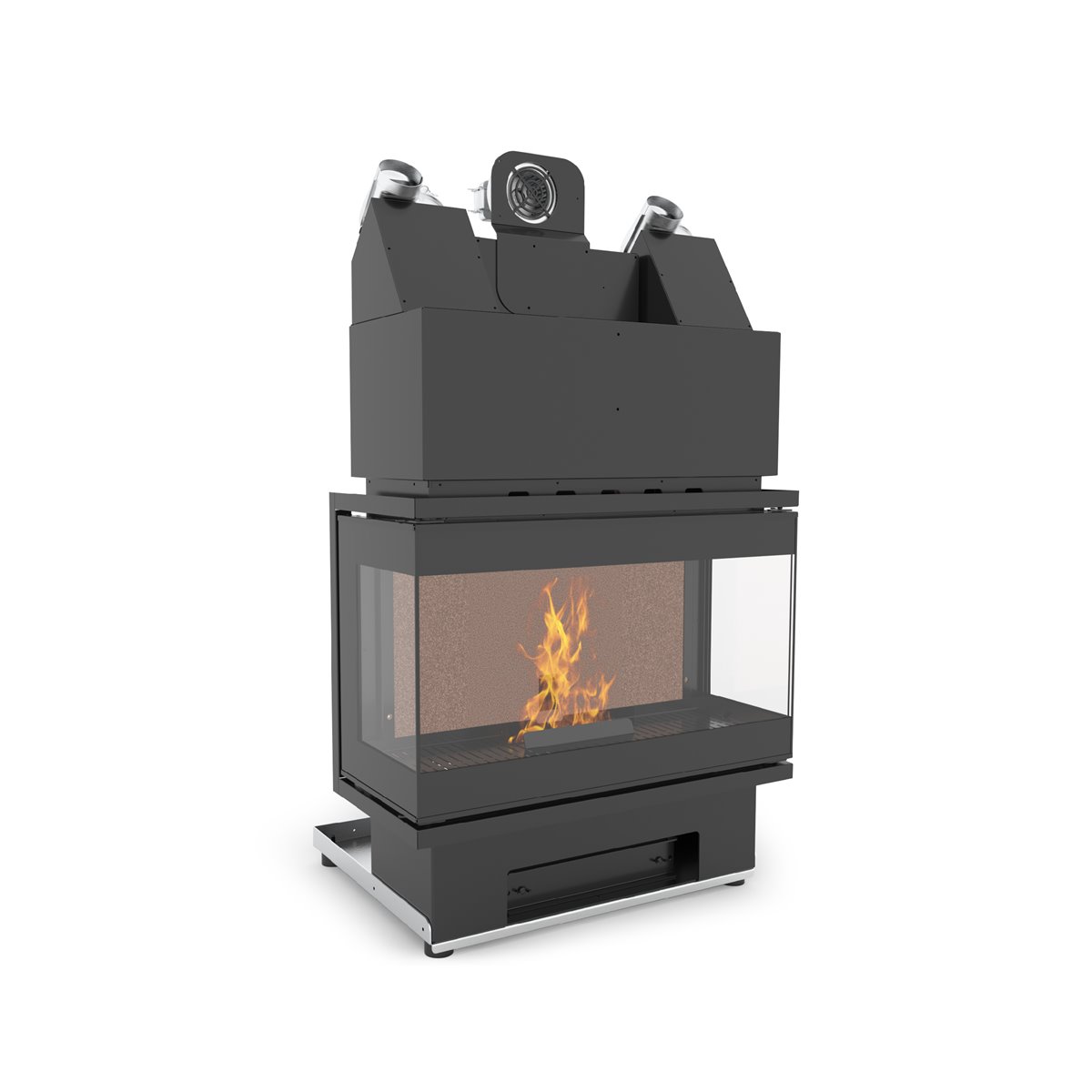 Vista fiamma a 180° con piano fuoco in acciaio a pianta rettangolare e parete di fondo e fianchi in vermiculite.