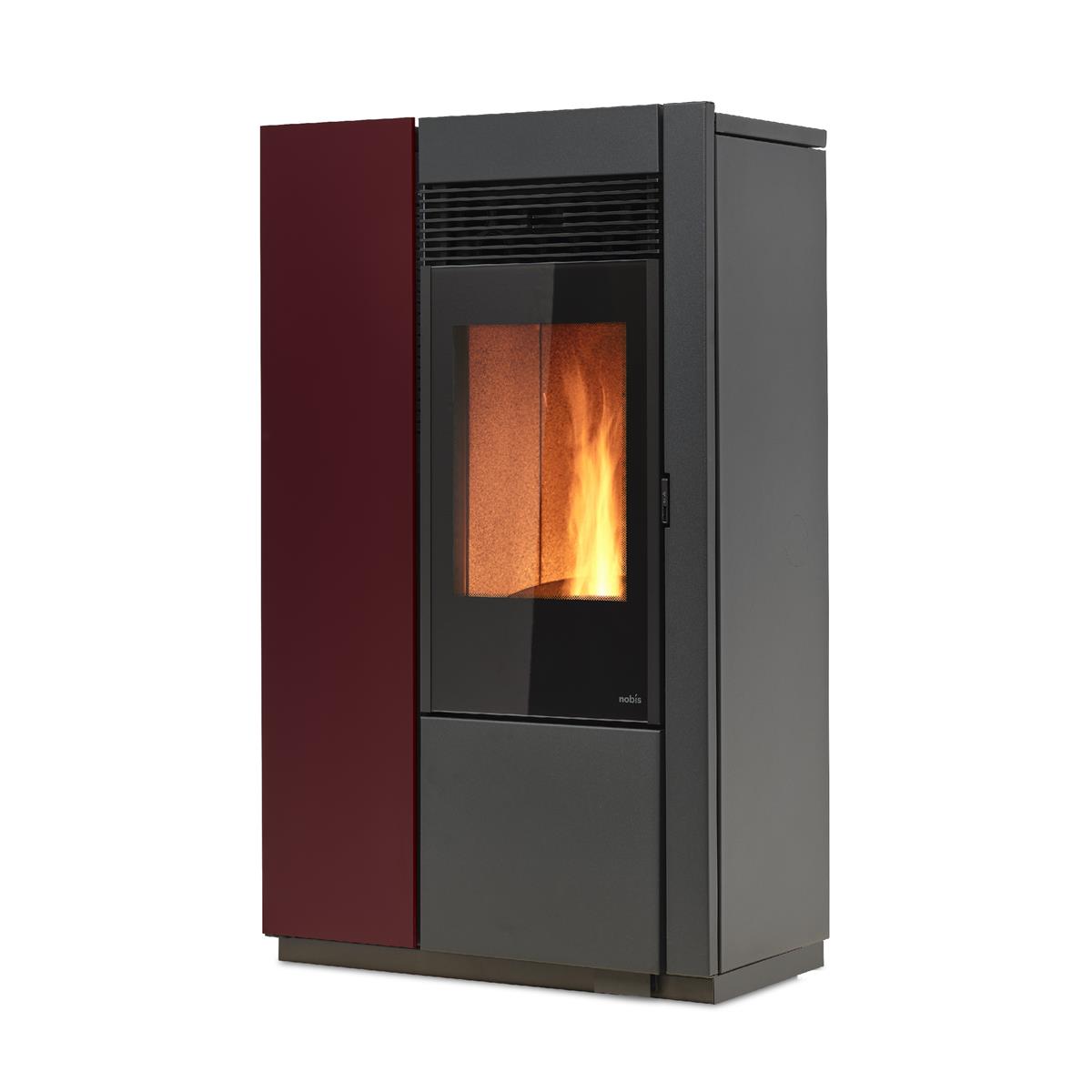 Stufa a pellet a ventilazione frontale con rivestimento in acciaio colorato.
