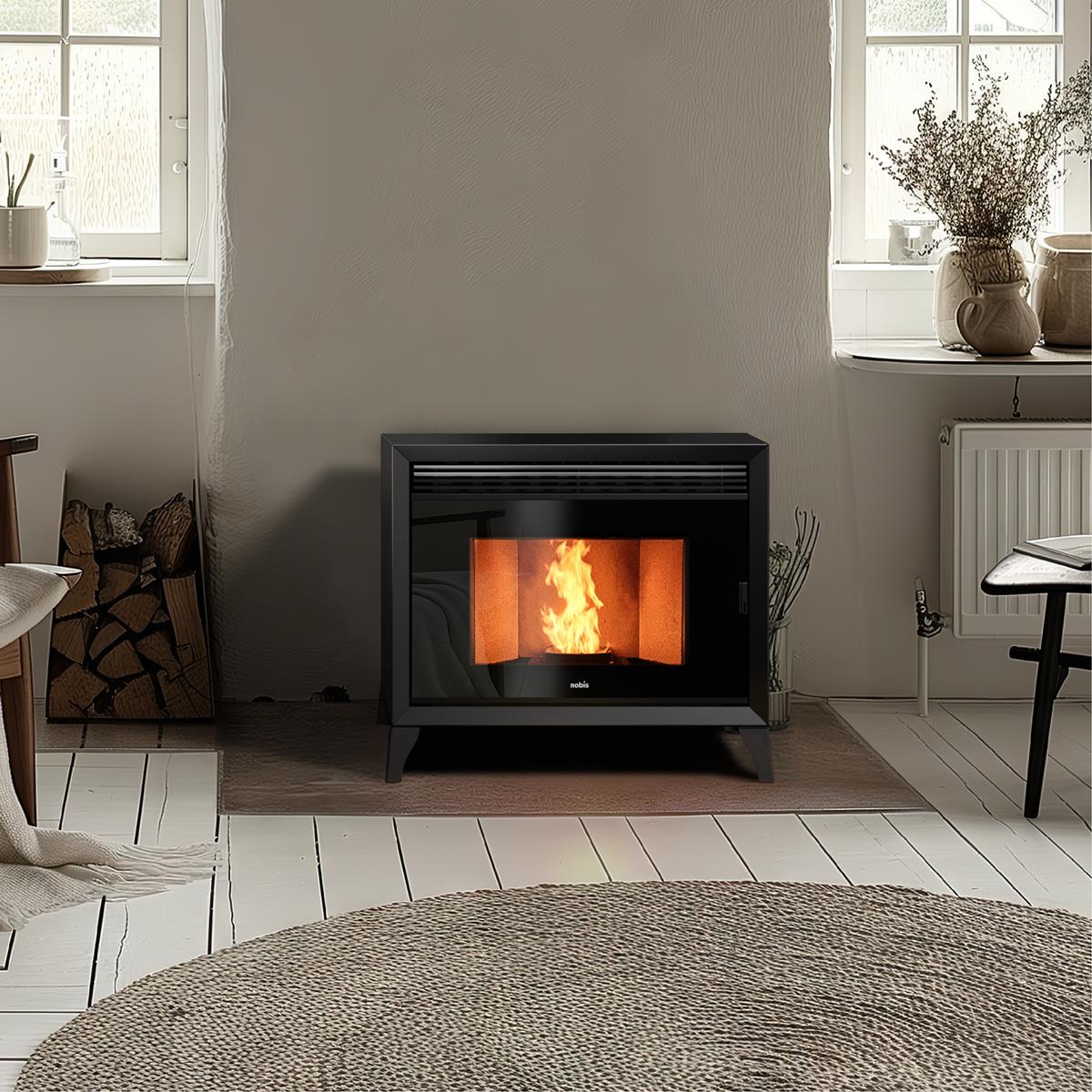 - Stufa a pellet di dimensioni compatte a ventilazione frontale con motore centrifugo 400 m3/h