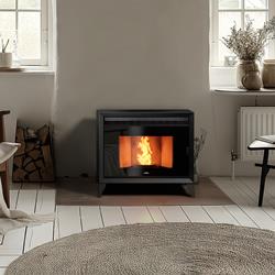 Stufa a pellet ad aria con rivestimento in acciaio verniciato.