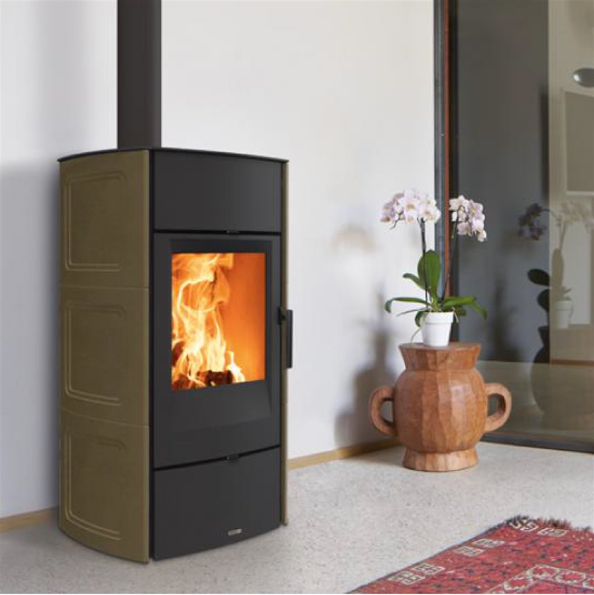 Stufa di design semplice e moderno che si fa apprezzare per le sue geometrie. La sua struttura elegante è caratterizzata da linee pulite. Il suo rivestimento in maiolica aggiunge un tocco di raffinatezza all’ambiente circostante, nei colori Bianco, Rosso Lava, Verde Mirto.