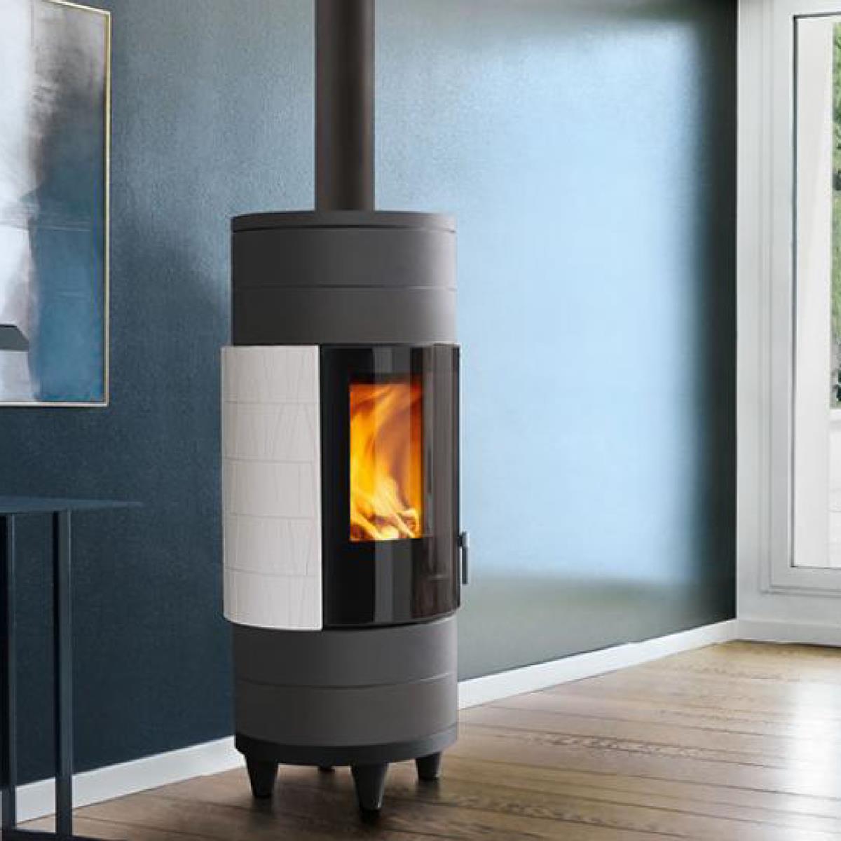 Design originale e accattivante per una stufa a legna rivestita in Maiolica nei colori Bianco, Ardesia, Grigio Cerato, Rosso Lava o bicolore Bianco Grigio/Terra Cotta e Bianco/Ardesia.
