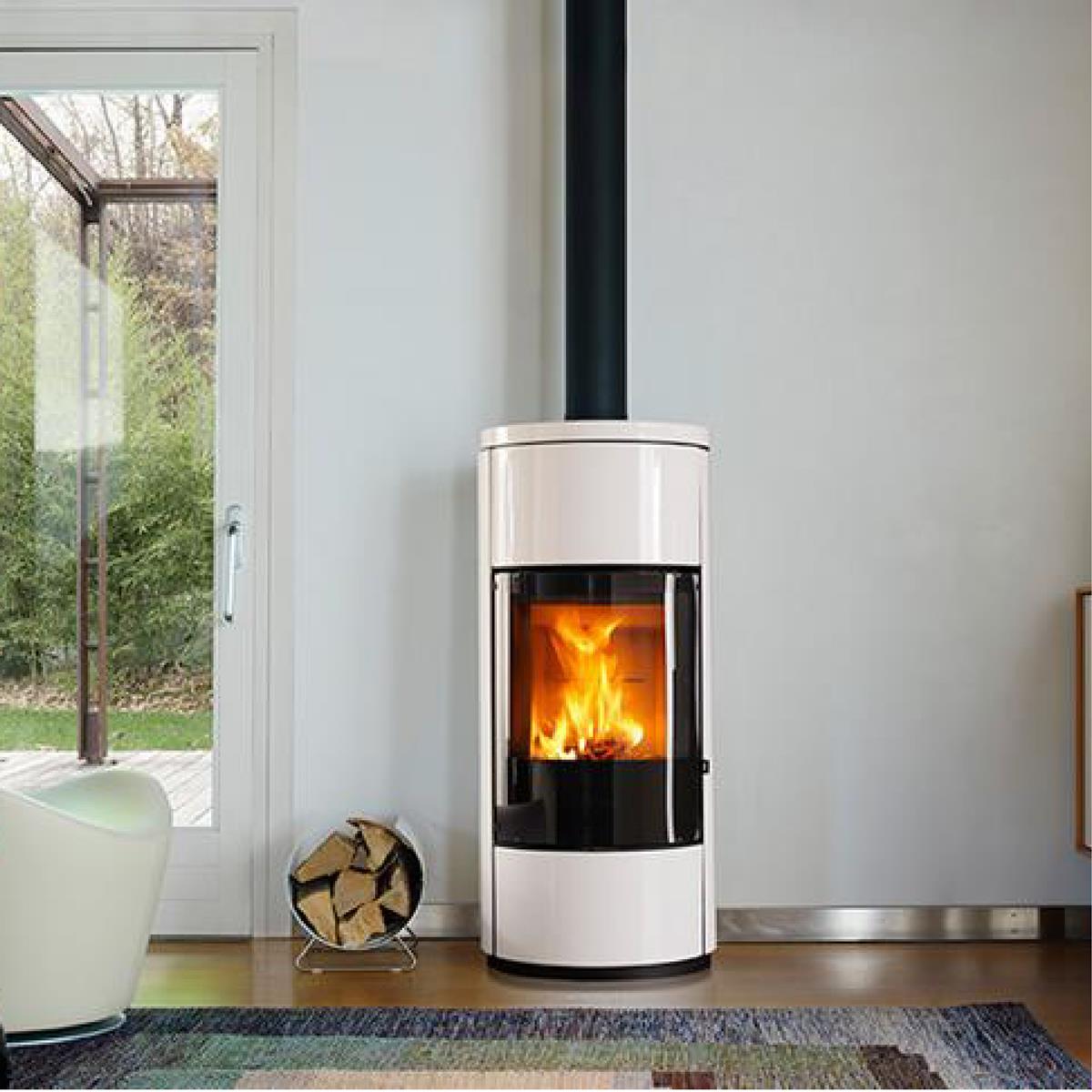 Design essenziale e semplicità delle forme per inserirsi in differenti soluzioni di arredo. Stufa a legna rivestita in Maiolica nei colori Bianco, Ardesia, Grigio Cerato, Nero Opaco, Rosso Lava, Giallo Acceso. Il vetro curvo a filo porta offre massima visione del fuoco e un design esclusivo.